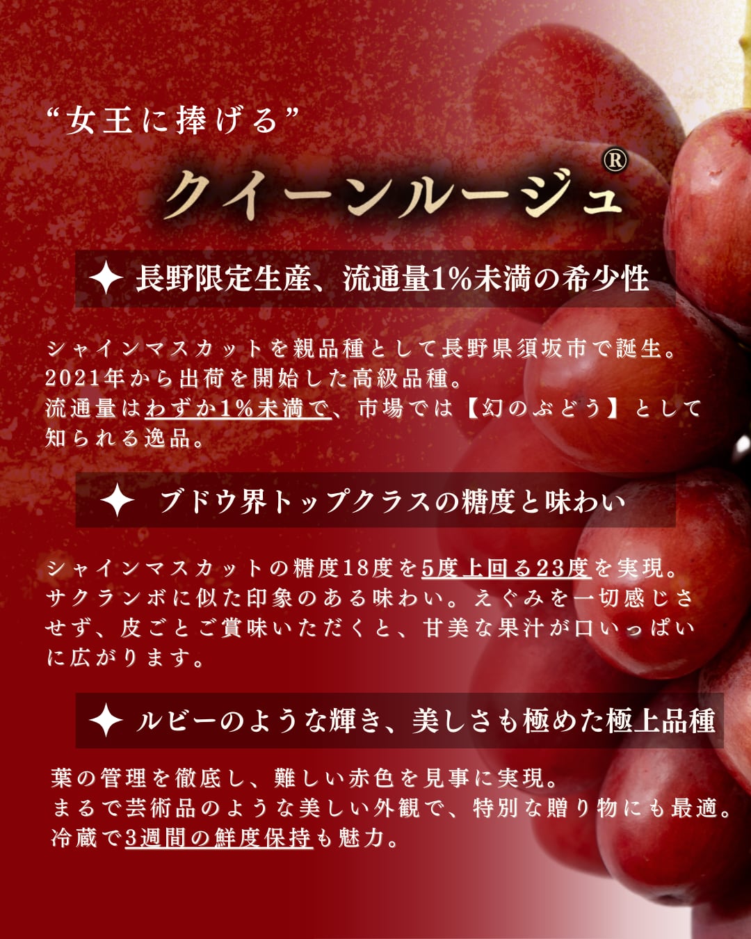 「クイーンルージュ®︎」は、須坂市で誕生したシャインマスカットを親品種とする長野県限定生産の県オリジナル品種です。2021年に初出荷された高級品種で、市場の流通量が1%未満であることから【幻のぶどう】とも呼ばれています。